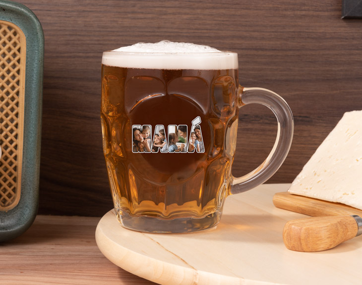 • Jarra de vidrio (55 cl). • Tarjeta Recordatoria. Nuestras madres se han ganado el cielo con lo mucho que han hecho y hacen por nosotros: ayudarnos a crecer, apoyarnos cuando lo necesitamos, estar a nuestro lado incondicionalmente… hay pocas cosas que puedan estar a su altura, pero si lo que queremos es devolverle un poco de lo que nos han dado, optar por sorprenderla con un regalo emotivo siempre es la mejor opción, ya que son los más valiosos. Por ello, los detalles personalizados como el de nuestra jarra bávara personalizada Mamá son siempre un acierto seguro. No solo son la mar de prácticos, si no que están pensados para emocionarla. Nuestras jarras bávaras de cerveza cuentan con un diseño elegante y atractivo, gracias a la estética que proporciona su exterior facetado. En uno de los lados, tendremos un área circular lisa, que es dónde irá impreso el diseño Mamá que registréis al hacer el pedido. Son jarras más bajas y anchas que una jarra de cerveza normal. Cuentan con un grosor de unos 4 mm y un asa para aislar el líquido del calor de la mano y evitar que se recaliente. Este tipo de jarra no está pensada para lavarse en el lavavajillas, ya que el producto se personaliza con una impresión directa en el vidrio que puede verse alterada con lavados agresivos. Lo mejor para garantizar su durabilidad, es lavarla a mano y de forma suave, sobre todo en la zona de la impresión. Para la personalización, necesitarás cuatro fotografías que sean especiales para tu madre. Contarás con un botón A+ por cada letra, que te permitirá ajustar el diseño. Solo tienes que ir pulsando en cada letra y colocar la fotografía que desees para cada una. Una vez formado el diseño, nosotros lo recibimos y lo imprimimos en la jarra a todo color y listo para sorprender a quien más quieres.
