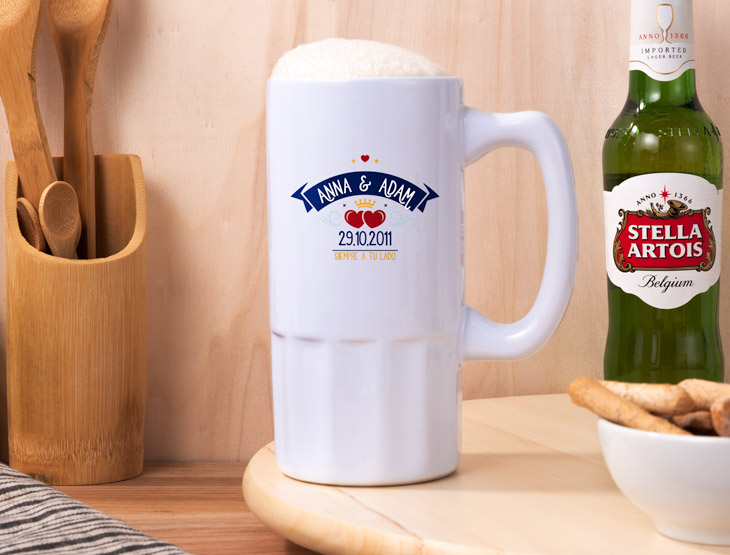 Creada única y exclusivamente para las parejas más cerveceras, las que nunca piensan separarse, las que se quieren de verdad de la buena. Una jarra de cerveza en la que incluye vuestros nombres y la fecha de ese día tan tan especial. Este diseño original hará mucho más especiales vuestros momentos juntos, seréis la pareja más molona con esta jarra de cerámica, además la gran calidad del producto guarda la esencia de tu cerveza favorita hasta en el último trago. El amor por la cerveza como el vuestro, para siempre…
