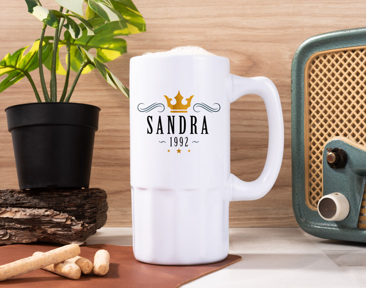 Estás buscando un regalo de cumpleaños para esa persona que siempre es la reina de la fiesta con su cerveza en la mano y no sabes que puede encajar perfectamente con él o con ella… ¡No te preocupes! Ya tenemos su regalo perfecto. Esta jarra de cerveza de cerámica personalizada tiene un diseño de lo más real y original pues está pensada para el más o la más elegante del grupo. Los materiales con los que está hecha esta jarra ayudan a mantener la esencia de su cerveza preferida hasta en el último trago. ¿A qué esperas? Dinos su nombre y nos pondremos a preparar ya su regalo.