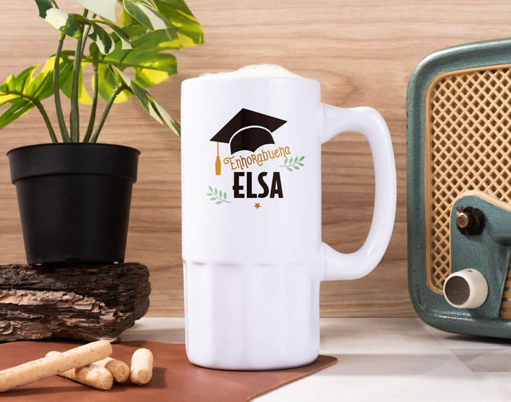 Ya ha terminado de estudiar, ha aprobado todas sus asignaturas y le ha costado un gran esfuerzo, pero ya está graduado o graduada y eso habrá que celebrarlo, ¿no? Y que mejor que con este regalo original para que pueda disfrutar de su graduación como se merece. Nuestra jarra de cerveza de cerámica personaliza es el regalo que todo graduado o graduada quiere… ¿a quién le gusta más la cerveza que a los y las estudiantes? Este detalle le encantará porque todo esfuerzo tiene su recompensa. Dinos el nombre del graduado o de la graduada y nos pondremos a ello enseguida.