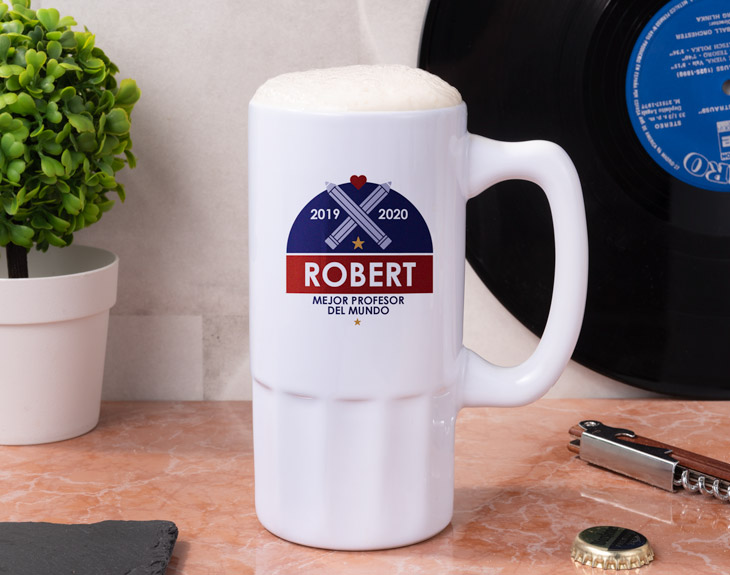 Se acaba el curso y no sabes cómo agradecer a ese profesor o a esa profesora todo lo que ha hecho por ti y todo lo que te ha enseñado. Todos y todas hemos tenidos profes que han marcado etapas en nuestras vidas y querremos que siempre nos recuerdes, como nosotros a ellos o a ellas. Este diseño de esta jarra de cerveza de cerámica personalizada está pensado para siempre estar en la memoria de esos o esas buenas profes. El mensaje ‘Mejor profe del mundo’ lo personalizas con su nombre y con el año del curso. ¿No te parece una idea genial? Seguro que a tu profe le va a encantar.