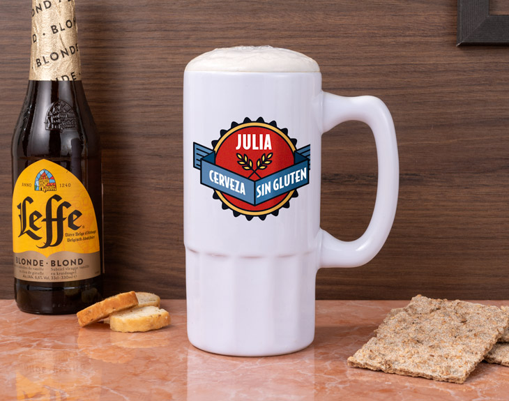 El 1% de las personas europeas son celiacas, es decir, tienen una intolerancia permanente al gluten que es una proteína presente en algunos cereales como es en el trigo y en la cebada. La cerveza suele estar casi siempre compuesta por cebada, pero por suerte, se ha creado la cerveza apta para ellos y ellas, elaborada a base de maíz. Nosotros hemos pensado en ti, en el celiaco o la celiaca de la casa, y hemos creado esta jarra de cerveza de cerámica personalizada para que tengas tu jarra única y solo bebas de tu cerveza. Solo hace falta que nos digas como te llamas y nosotros haremos el resto para que puedas disfrutar cuanto antes de tu cerveza como te mereces.