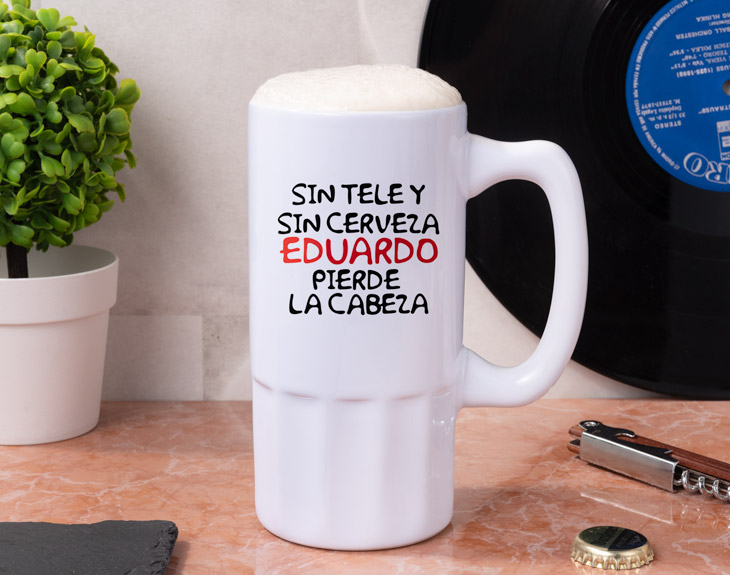 ¿Quién no tiene un amigo o una amiga a la que su plan favorito de fin de semana es quedarse en casa viendo pelis sin parar y tomando mucha cerveza? Si estas buscando un regalo para una persona así, aquí tienes el más original y auténtico. Este diseño ha sido pensado para esas personas que no pueden vivir sin ver la televisión y sin beber cerveza, por eso que mejor lugar para poner este diseño que en esta jarra de cerveza de cerámica personalizada. Además, esta jarra cuenta con una calidad que permite mantener el sabor y el aroma de su cerveza preferida hasta en el último trago