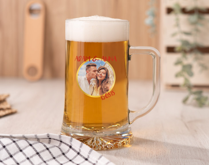 ¿Sois unos amantes de la cerveza? ¿Os gusta pasar las tardes tomando una cerveza bien fresquita? ¿Queréis tener un recuerdo diferente? Todo es posible con esta jarra de cerveza personalizada dedicada a todos los amantes de la cerveza. Un detalle perfecto para acompañar esas tardes de verano y disfrutar de una cerveza con vistas, ya que podréis tener delante vuestra historia de amor o un recuerdo especial. Podréis rememorar algún momento en concreto gracias a poder incluir la fecha de ese día que no se os olvidará. Añade vuestra foto favorita dentro de este círculo con un diseño muy elegante, en dorado, indícanos vuestros nombres y esa fecha especial que representa tanto para vosotros, y deja que este regalo tan original le sorprenda. Importante: esta jarra no se puede meter en el lavavajillas. Diámetro interior: 7cm Medidas aproximadas: 8,5 x 15,5 cm