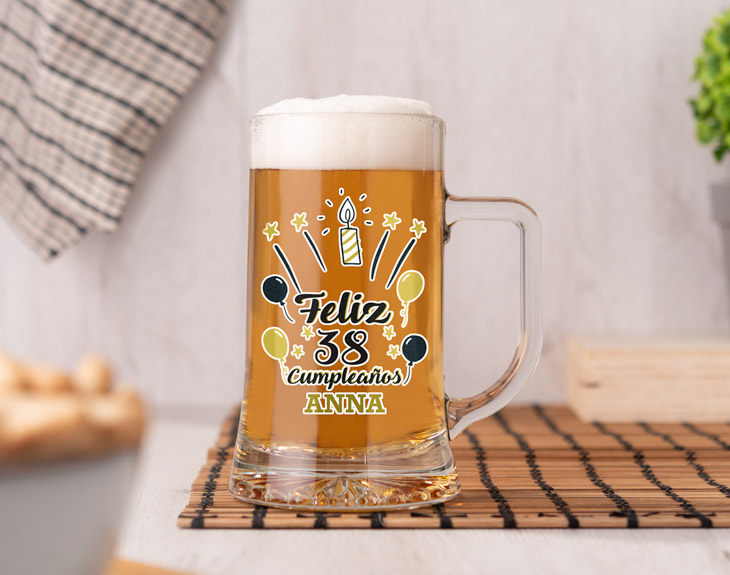 Sabemos lo complicado que puede llegar a ser cumplir años. A ninguno nos apetece dejar atrás la juventud de nuestra vida pasada y comenzar una nueva etapa. ¿Recuerdas esos viejos tiempos en los que todo era muchísimo más fácil? ¡Estamos seguros de que miras al pasado con una añoranza tremenda! Sin embargo, también creemos que todas las etapas de nuestra vida cuentan con diferentes puntos positivos y negativos. Por ejemplo... ¡Puedes celebrar una gran fiesta de cumpleaños! Cada año se debe inaugurar con una buena celebración, y nosotros queremos que este sea de lo más elegante. Para ello contamos con esta jarra de cerveza personalizada, hecha exclusivamente para los cumpleaños más elegantes. Si tu amigo es un fanático de la cerveza, esta jarra de cerveza impresa en color le vendrá de lujo. Hecha en vidrio, cuenta con un diseño ideal para el cumpleañero. Lo único que tendrás que hacer para personalizar este regalo original es entrar en el diseñador, escoger el diseño que más te guste, y personalizarlo con el nombre y/o la edad del afortunado/a. Importante: esta copa no se puede meter en el lavavajillas. Diámetro interior: 7cm Medidas aproximadas: 8,5 x 15,5 cm