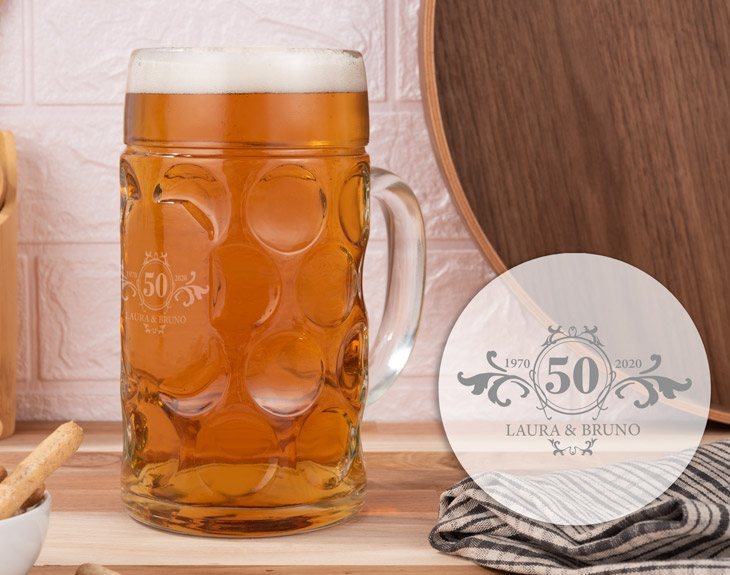 Vuestro amor es tan longevo como vuestra relación, por eso lleváis juntos o juntas tantos años. ¡50 años! Ni más, ni menos. 50 años, casi una vida acompañados o acompañados. 50 años queriéndoos. 50 años cuidándoos. Vuestro amor hay que celebrarlo, por eso hemos creado esta jarra de cerveza personalizada con capacidad de hasta un litro. ¡Cabe tanta cerveza como amor dentro de vuestro corazón! ¿Qué esperas para comprar cerveza y celebrar vuestro aniversario? En esta jarra grabaremos vuestros nombres y el año en que os conocisteis.