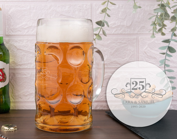 Lleváis 25 años compartiendo vuestras vidas. 25 años repletos de amor. 25 años llenos de alegrías. 25 años queriéndoos incondicionalmente. 25 años de cuidándoos mutuamente. El camino no ha sido fácil, pero entre ambos o ambas habéis construido una vida en pareja. Para celebrar vuestro amor tan grande hemos diseñado esta jarra de cerveza personalizada con capacidad de hasta un litro, para que disfrutéis de vuestra celebración con mucha mucha cerveza. El diseño de esta jara es muy romántico y original pues incluye vuestros nombres y el año en que nación esta relación tan bonita. ¿No te parece una idea súper romántica?