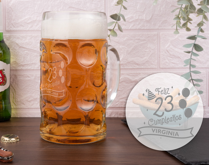 ¿Estás preparando una fiesta sorpresa a ese amigo o a esa amiga por su cumpleaños? Ya has visto que aquí tenemos un montón de cosas para personalizar y todos los artículos que necesitas para una fiesta sorpresa. Esta jarra de cerveza personalizada con capacidad de hasta un litro es perfecta para esa fiesta, el cumpleañero o la cumpleañera se va a sentir súper especial al ver a todos los suyos con esta jarra personalizada. ¡La cerveza no puede faltar! Con su nombre y los años que cumple terminaremos de preparar las jarras de cerveza para que empiece la fiesta cuanto antes.