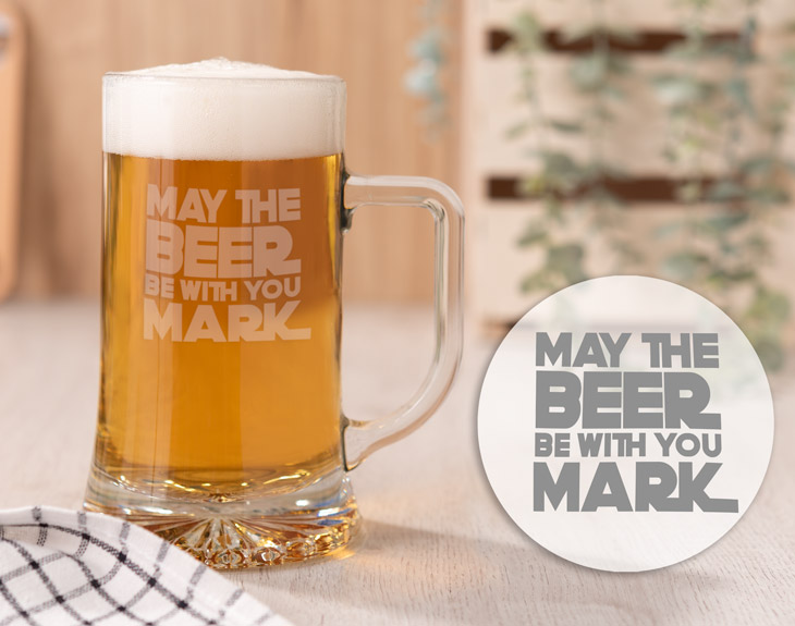 Todos tenemos un amigo que es muy friki de Star Wars y le encanta tener un montón de accesorios relacionados con la saga. Te traemos el regalo perfecto para estas personas, una jarra de cerveza personalizada con una adaptación de la frase más famosa "Que la fuerza te acompañe", en este caso es aún mucho mejor...¡Que la cerveza te acompañe! Y es que al verla seguro que está deseando comprar un montón de cervezas y preparar en su casa un maratón de Star Wars...¿acaso hay un plan mejor?. Solo necesitamos que nos digas el nombre de esa persona para poder insertarlo en el diseño y se sentirá como el auténtico Luke Skywalke. ¡Seguro que a partir de ahora no quiere beber en otra jarra que no sea esta! Diámetro interior: 7cm Medidas aproximadas: 8,5 x 15,5 cm