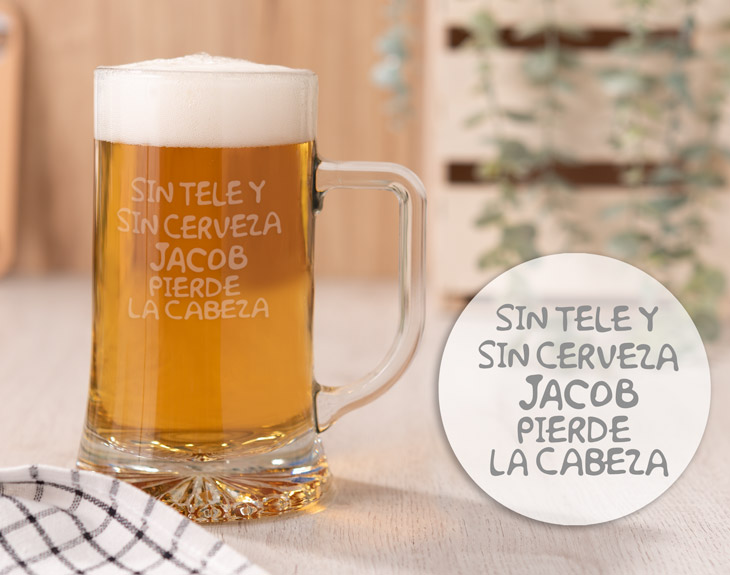 ¿Vaguear es lo tuyo? ¿Ver el fútbol con una cerveza te encanta? ¿Disfrutas con tus amigos delante de la tele con unas cervecitas? Esta jarra de cerveza grabada es perfecta para ti y todos tus amigos. Solo necesitamos que nos digas el nombre para que podamos grabarlo junto a esta creativa frase. Si pierdes la cabeza sin tele y sin cerveza, no digas más, solo tu nombre para que podamos prepararte esta jarra tan original. Sabemos que tomar cerveza es uno de los mayores placeres de la vida, pero hacerlo con una jarra personalizada es lo mejor que te pasará en la vida. ¡Es un auténtico placer! Si quieres divertirte todavía más con tus amigos, bebe cerveza, pero hazlo de manera elegante: con una jarra de cerveza grabada con tu nombre. Tienes la opción de comprar una, dos, tres o cuatro, pero si quieres una para cada amigo, pídenos presupuesto y lo ajustaremos. ¡Anímate a vivir la vida de una manera original! Diámetro interior: 7cm Medidas aproximadas: 8,5 x 15,5 cm