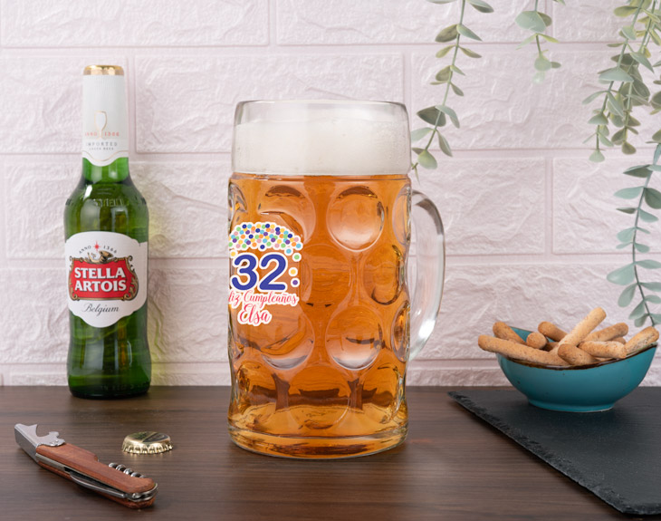 • Jarra de vidrio (1 litro). • Tarjeta Recordatoria. Los cumpleaños son una de las fechas más importantes del año para nuestros seres queridos, y por ello merece la pena celebrarlos por todo lo alto. Si es una persona importante para ti, bien merece la pena esforzarse por encontrar un regalo especial y único que deje huella. Para esas ocasiones, nada viene tan bien como optar por un regalo personalizado, que demuestra al 100% lo mucho que hemos pensado en esa persona y lo que nos hemos esforzado en buscar un regalo original y especial. Nuestras jarras gigantes son impresionantes tanto en tamaño como en estética. Son el modelo más grande de jarras de cerveza que tenemos disponible y son perfectas para los más cerveceros gracias a su capacidad de hasta un litro. La parte externa es facetada, lo que aporta un plus de estilo al regalo. En la parte frontal, encontramos una zona circular lisa que es dónde irá impreso el diseño. Esta jarra mantiene de forma genial la temperatura de la cerveza, ya que cuenta con un asa para sujetarla (y así que el calor de la mano no caliente la cerveza) y un grosor mayor que el de una jarra de pequeño tamaño. Para fabricar el producto, nosotros imprimimos el diseño directamente en la jarra, por lo que es importante no lavarla nunca en el lavavajillas, ya que puede afectar a su durabilidad. En su lugar, recomendamos el lavado a mano, siendo especialmente suave en la zona de la impresión. El proceso de personalización es muy sencillo. Accederéis a la plantilla del diseño de la jarra en la que solo tendréis que agregar la edad y el nombre del destinatario. Nosotros tomamos ese diseño y lo trasladamos a vuestra jarra de cerveza gigante, listo para regalar y sorprender a quién más quieres.