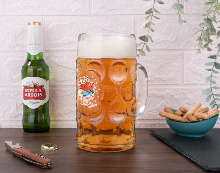 Sois unos apasionados de la vida. Os gusta pasar tiempo juntos disfrutando de los pequeños placeres del día a día. Pero lo más importante de todo es que os queréis hasta el infinito ¡y más allá! Una jarra personalizada con un litro de capacidad es el regalo perfecto para aquellas parejas que además de ser las más románticas del lugar, son unos amantes cerveceros. Con este regalo original no fallarás. Esta jarra tiene un diseño muy especial, con dos corazones surcando las olas que generará tu cerveza dentro de esta jarra, disfrutando de la compañía del otro. Personaliza esta jarra con el nombre de esa persona tan especial en tu vida, y llega hasta su corazón con nuestra jarra personalizada. Importante : la jarra no es apta para lavavajillas. Diámetro interior: 9,5 cm