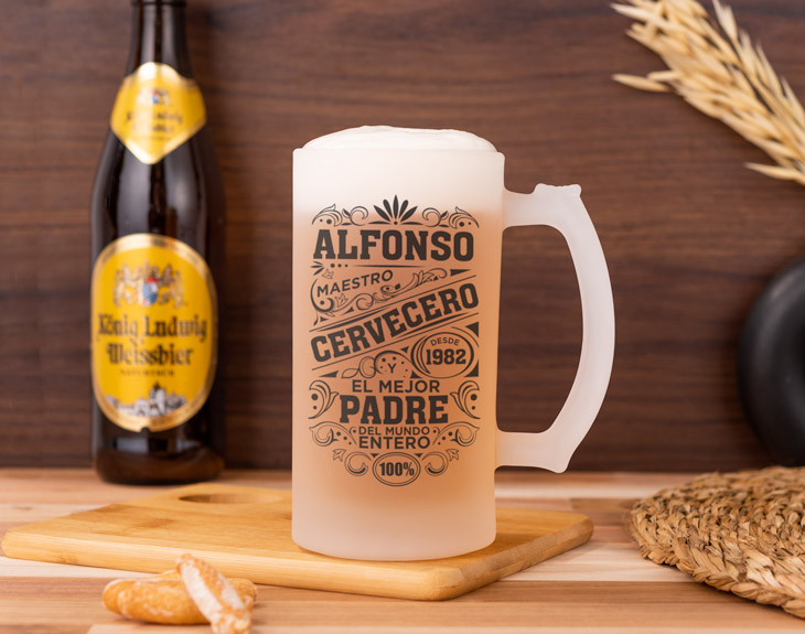 Un buen descanso siempre es el mejor regalo para un padre. Después de estar todo el día trabajando en casa y fuera de casa, ¡sólo necesita un poco de paz! Si el tuyo es de los que la buscan con una cerveza sobre la mesa, le encantará acompañar esos momentos tan relajantes con su propia jarra de cerveza opaca personalizada. ¡Con casi 8 centímetros de diámetro para rellenar con medio litro de su bebida favorita! Puede usarla todo lo que quiera y lavarla en el lavavajillas, ya que el diseño impreso no se perjudicará. Por muchas cervezas que tenga, seguro que ninguna tiene un diseño tan llamativo como este junto a su propio nombre. ¡Y hasta su año de nacimiento! Hemos creado este diseño para que conviertas a tu padre en un auténtico maestro cervecero con tan solo unos clics. Añade el producto al carrito y crea a tu gusto esta jarra de cerveza personalizada. Todo ello se verá perfectamente a través de la superficie traslúcida, sobre todo cuando esté llena de cerveza o cualquier líquido más oscuro. Qué mejor regalo original para padres que una bonita dedicatoria personalizada impresa sobre su propia jarra de cerveza opaca. ¡Ideal para conservar la temperatura de la bebida mientras disfrutáis en familia! Capacidad: 500ml.