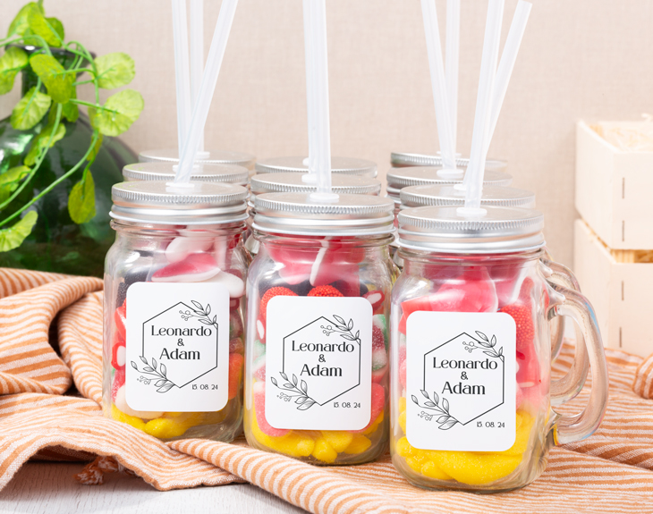 Estamos seguros de que el mejor recuerdo que puedes regalar en tu boda son nuestra jarras de smoothie personalizadas "Flores de amor" con chuches. Y es que... ¿Acaso hay mejor regalito que las chuches? ¡Está claro que no, endulzan a cualquiera! Son ideales para que los seres queridos se lleven un recuerdo inolvidable de este día tan especial.