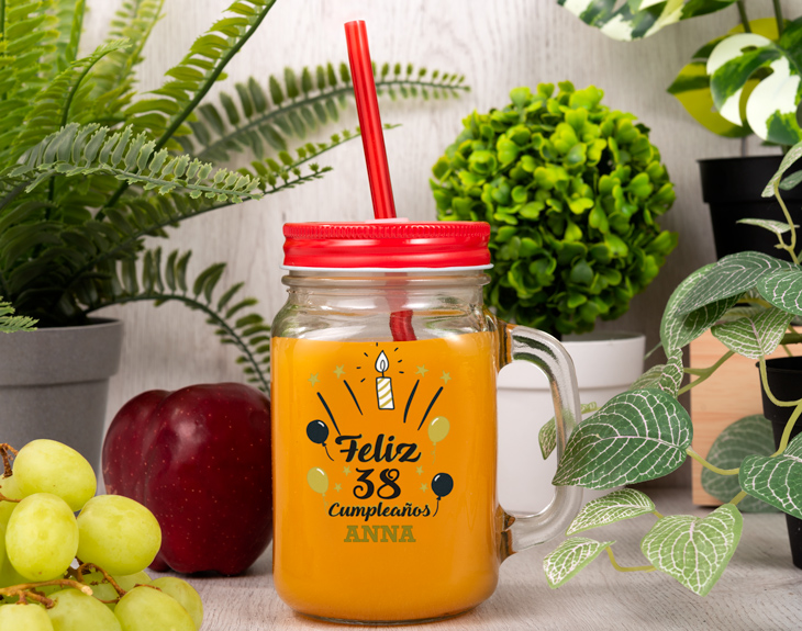 ¿Se acerca el cumple de tu mejor amigo y este año quieres sorprenderle con un regalo original? No habrá detalle más especial que el tuyo si optas por esta preciosa jarra de smoothies personalizada Cumpleaños elegante. Un precioso regalo con el que esa personita a la que tanto quieres podrá disfrutar de un fresco batido o cóctel en los meses más calurosos del verano. Nuestras jarritas cuentan con asa y pajita, así como con una tapa con estampado aleatorio, que completan un producto tan práctico como bonito. Pero lo mejor, sin duda, es que podemos personalizar la jarra con el nombre del destinatario o con su nombre y la edad que cumple. Durante la fase de personalización, anota el nombre de tu amigo o el nombre y la edad, dependiendo del diseño que escojas, y nosotros nos encargamos de imprimirlo sobre la jarra para que tengas tu regalo cuanto antes. A partir de ahora, esa persona a la que tanto quieres podrá disfrutar de un delicioso smoothie, batido, cóctel o infusión en su nueva jarra personalizada. ¡El día de su cumpleaños no querrá separarse de ella! Hazte con este regalo original de cumpleaños con el que seguro, acertarás de lleno ¡IMPORTANTE! Los tapones para la jarra pueden ser diferentes. Te llegará a casa uno ideal para ti, pero no podrás elegirlo, ¡es sorpresa! Importante: esta jarra no se puede meter en el lavavajillas.