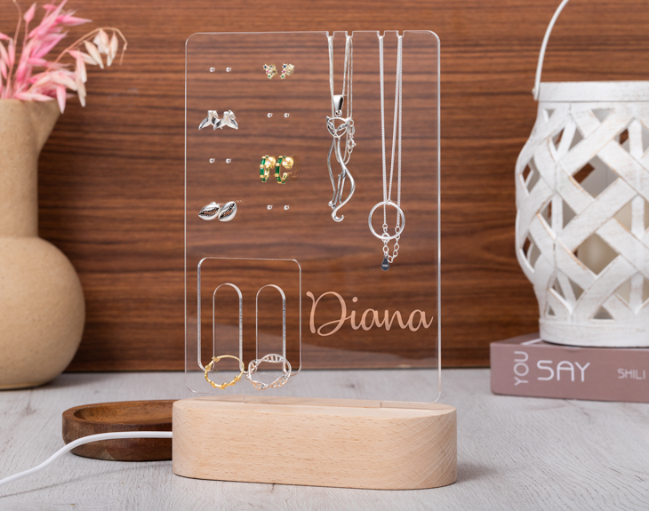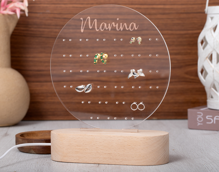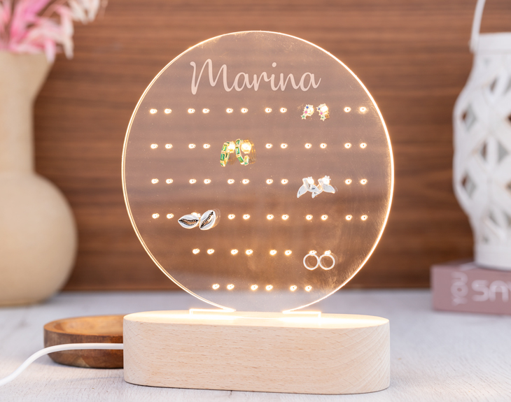 Cuando es hora de arreglarte y mirarte al espejo, siempre vas a agradecer un poco de luz extra. ¡Hay que tener mucho ojo para elegir y ponerte bien los pequeños complementos de joyería para la cara! Tenlos todos reunidos con una preciosa luz sobre esta lámpara para pendientes personalizada. Enchúfala con el pequeño cable USB incluido y verás como luce tu nombre grabado sobre el metacrilato.