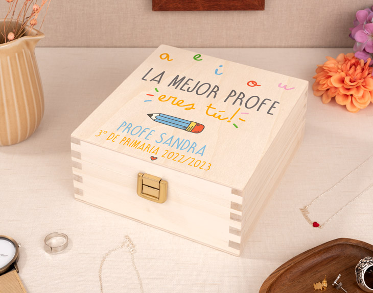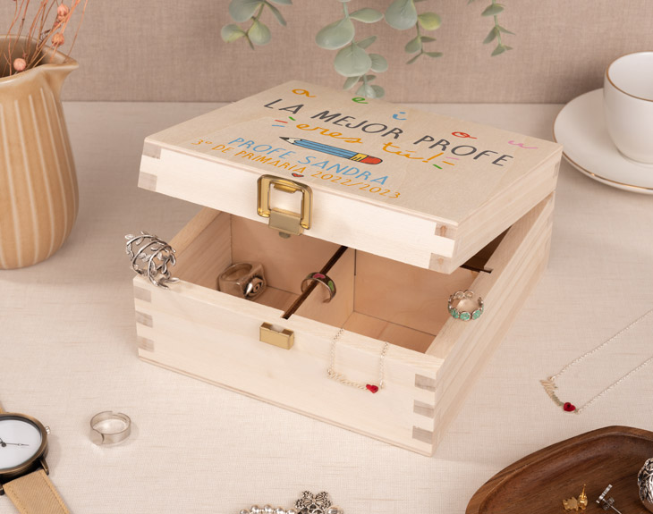 Los maestros dan todo su tiempo a sus alumnos a lo largo del curso escolar, por lo que se merecen una recompensa a la altura. ¡Este joyero de madera personalizado con tapa es perfecto para sorprender a la mejor profe! Un joyero con compartimentos para guardar y proteger sus mejores joyas. Si la profe de tus hijos se ha volcado en enseñarles las tablas de multiplicar y las vocales, este joyero de madera con diseño para profes es lo que estabas buscando para finiquitar el curso por todo lo alto. Esta caja hecha en madera cuenta con unas medidas de 16 centímetros en cada uno de sus lados y 8 centímetros de altura. Cada compartimento cuenta con unas medidas de 7 centímetros, por lo que podrá guardar cualquier cosa: anillos, pulseras, colgantes... ¡Todos sus tesoros! ¿Quieres dejarle claro que ha sido la mejor profe durante estos largos meses de curso? Este regalo original de fin de curso está pensado para ella... ¡Y cuenta con un diseño de lo más cuqui! Lo mejor es que podrás personalizarlo con su nombre y el nombre de la clase en la que ha impartido todos sus conocimientos. En el diseñador podrás personalizar el diseño clicando sobre los cuadros de texto, escribiendo el nombre en el cajón de respuesta. ¡Quedará de lo más exclusivo! Medidas de la caja: 16 x 16 x 8 cm. (Largo x Ancho x Alto) Medidas de cada compartimento: 7 x 7 cm. Importante: Las maderas tienen vetas y estas quedan reflejadas en la imagen.