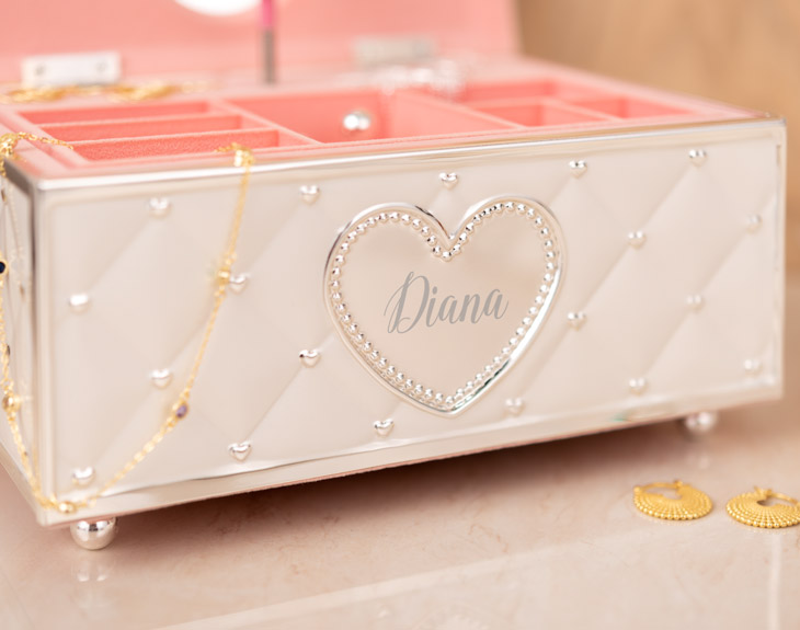 Para completar un regalo redondo, podremos convertir este joyero en un producto único gracias a la posibilidad de personalizar su corazón central con el nombre de la destinataria del regalo. El