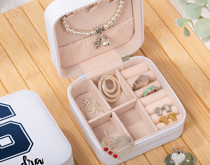 • Joyero portátil pequeño personalizado. • Tarjeta Recordatoria.