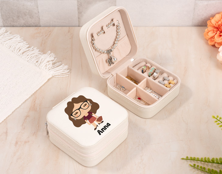• Joyero portátil pequeño personalizado. • Tarjeta Recordatoria.