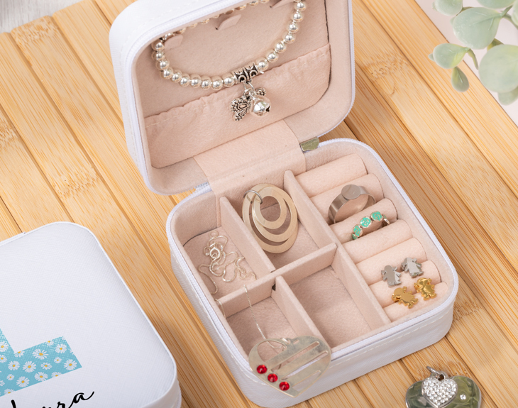 • Joyero portátil pequeño personalizado. • Tarjeta Recordatoria.
