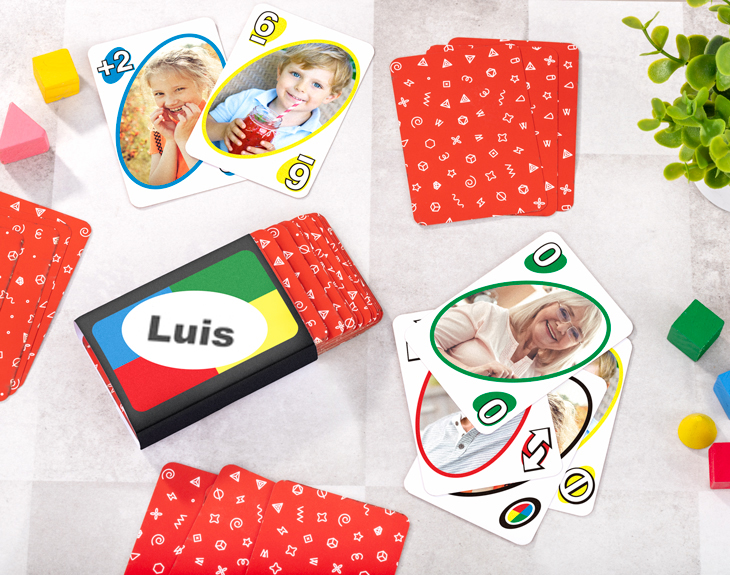 Una de las barajas de colores más divertidas y con más seguidores en todo el mundo. Ahora puedes tener tu propia versión, totalmente personalizada. ¡Un regalo perfecto para toda la familia! La baraja personalizada de colores incluye 108 cartas únicas. Eso si: en vez de cuatro colores, podrás crear palos con cuatro fotos. Seguro que se convertirá en un objeto de coleccionismo muy especial para tu familia. Medidas aproximadas de cada carta: 8,7 x 6,3 cm.
