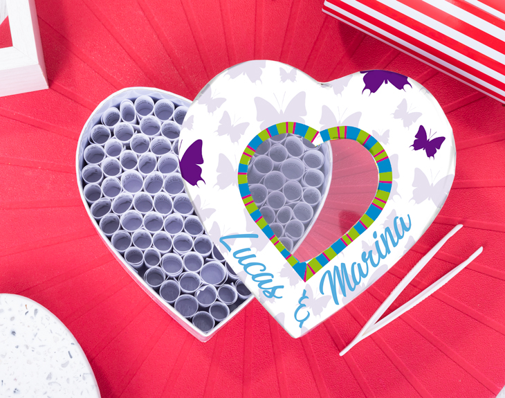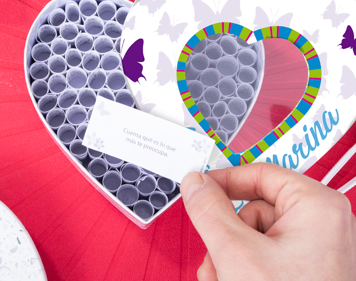 ¿Queréis conoceros de la manera más romántica y divertida? Aquí tienes un corazón con más de cien desafíos amorosos, perfecto para conocer aun más a esa persona especial. ¿Qué es lo que hace que te derritas por tu pareja? ¿Cuales son vuestras canciones favoritas? La respuesta a estas y otras muchas preguntas está en esta caja. Ahora puedes personalizar la tapa con los nombres de la pareja. ¡Crea un momento íntimo y único mientras conocer al que tienes enfrente de una manera muy divertida! Medidas: -Caja: 5cm alto x 15 cm ancho -Papelitos: 3cm de alto aproximadamente.