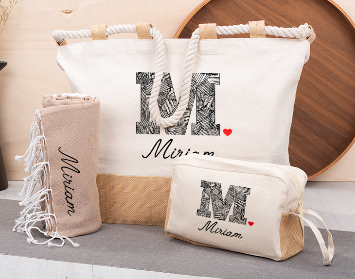 ¡Tenemos el kit imprescindible para este verano! Se trata de nuestro pack con toalla, bolso y neceser personalizado con diseño "Alfabeto Sketch". Además, ahora que llega el buen tiempo, este es el kit perfecto para ir a la playa o a la piscina. Es muy práctico porque podrás llevar todo lo necesario para pasar un día increíble. Además, lo mejor que tiene es que es personalizable, podrás escribir el nombre que tú quieras. ¡Así todos sabrán de quien es este pack personalizado! También se puede convertir en un regalo original para esa persona que cumpleaños en pleno verano, ¡le encantará! Personalizar este kit es muy sencillo. El primer paso a seguir consiste en añadir el producto al carrito y entrar al área de personalización. Una vez ahí, ya puedes escribir el nombre que tú quieras y escoger la inicial. Pronto estará perfecto y listo para regalar. ¡Será un original regalo para verano! Especificaciones del bolso: Medidas sin asas: 50 x 34 x 17,5 cm. Medidas de las asas: 50 cm. Material: 100% algodón. Gramaje: 280 g/m². Especificaciones del neceser: Medidas: 23 x 8 x 15 cm. Material: Yute / Algodón. Especificaciones de la toalla: Medidas: 180 x 90 cm. Material: 80% algodón / 20% poliéster. Gramaje: 180 g/m².