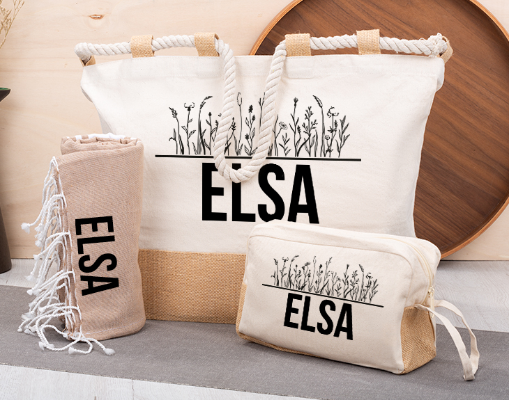 ¡El verano está a la vuelta de la esquina! Ahora llega la temporada de los planes fuera de casa, de ir a la playa o a la piscina y de no pisar por casa en todo el día. ¡Tenemos el kit de accesorios que no te puede faltar! Se trata de nuestro kit de toalla, bolso y neceser personalizado con diseño "Flores silvestres", es ideal para verano. Este kit incluye un neceser, que viene genial para guardar esos productos de aseo personal, una toalla para usar en la playa o piscina y con un bolso para guardar todo lo necesario para pasar todo el día fuera de casa. Y lo mejor de todo este kit es personalizable, podrás escribir el nombre que tú quieras. ¡Quedará genial! Personalizar este kit es muy sencillo. El primer paso a seguir consiste en añadir el producto al carrito y entrar al área de personalización. Una vez ahí, ya puedes escribir el nombre que tú quieras y escoger la inicial. Pronto estará perfecto y listo para regalar. ¡Será un original regalo para verano! Especificaciones del bolso: Medidas sin asas: 50 x 34 x 17,5 cm. Medidas de las asas: 50 cm. Material: 100% algodón. Gramaje: 280 g/m². Especificaciones del neceser: Medidas: 23 x 8 x 15 cm. Material: Yute / Algodón. Especificaciones de la toalla: Medidas: 180 x 90 cm. Material: 80% algodón / 20% poliéster. Gramaje: 180 g/m².