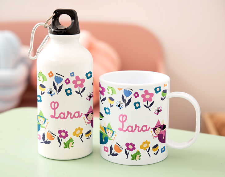 El mundo de las hadas es un universo en el que todo es posible. Todos nuestros sueños se pueden cumplir gracias al poder con el que cuentan nuestras hadas favoritas. Si tu hijo/a siempre siente su poder alrededor, tenemos claro que estas hadas serán sus mayores aliadas a la hora de volver al cole. ¡Este kit de botella y taza de plástico personalizada está hecho para él o ella! Este kit con botella y taza infantil con diseño de hadas le vendrá de perlas a la hora de comenzar la hora del almuerzo. Este pack incluye dos elementos: por un lado, una cantimplora de aluminio de 17 centímetros de altura y 400 mililitros de capacidad; por el otro, una taza de plástico libre de BPA con 33 centilitros de capacidad. ¡Es perfecto para que tu pequeño/a comience las clases con buen pie! Está claro que este regalo original para la vuelta al cole está hecho para que todos puedan comenzar las primeras clases del cole bien hidratados. Y para completar este regalazo, ¿qué mejor que personalizarlo con su nombre? En el diseñador podrás escribir el nombre o apodo que quieras. ¡Nosotros nos encargaremos de plasmarlo a todo color! Importante: El plástico de la taza no contiene BPA. Capacidad de la taza: 33 cl. Capacidad de la cantimplora: 400 ml. Medida de la cantimplora: 17 cm. Esta taza es apta para lavavajillas y microondas.