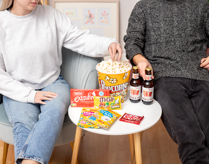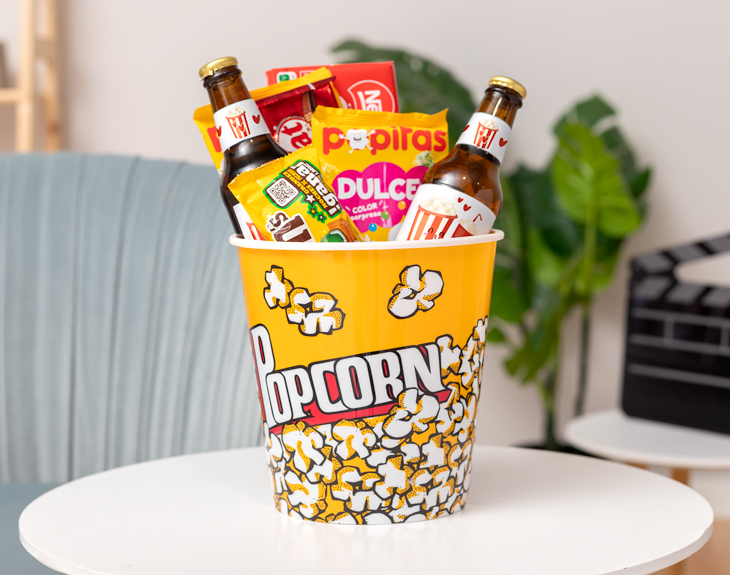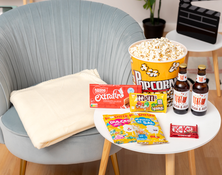 • Cubo para palomitas. • Paquete de palomitas saladas. • Paquete de palomitas dulces • 2 Botellines de cervezas personalizados (250 ml). • Tableta de chocolate con leche. • 1 Kit Kat. • Bolsa de M&Ms. • Manta (Opcional). • Tarjeta recordatoria.