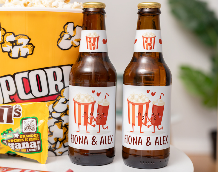 Si has encontrado a esa persona que tiene todo lo que busas en una pareja y estáis viviendo un auténtico amor de película, tenemos algo que os va a encantar. Se trata de nuestro kit de cine personalizado con diseño de "Amor de cine". Es ideal para que organizaréis una tarde entera de maratones de vuestras series y pelis favoritas. ¡Será una cita súper romántica! Y es que este kit de cine incluye todo lo necesario para hacer un maratón de pelis en casa. Viene con dos bolsas de palomitas (una de sal y otra de dulce), un cubo para poner las palomitas, una bolsa de M&M´s, un Kit Kat, una tableta de chocolate extrafino y dos botellines de cervezas personalizados. Si estás pensando en preparar un cita de cine con tu pareja, está claro que este kit es ideal. Y mejor es que podéis personalizar los botellines de cerveza con vuestros nombres. ¡Es genial! Personalizar este kit de cine es súper sencillo. El primer paso a seguir consiste en añadir el producto al carrito y entrar al área de personalización. Una vez ahí, ya puedes escribir vuestros nombres. Pronto quedará perfecto y listo para regalar. ¡Será un original regalo para parejas! Colores disponibles de la manta: blanco, negro o amarillo.