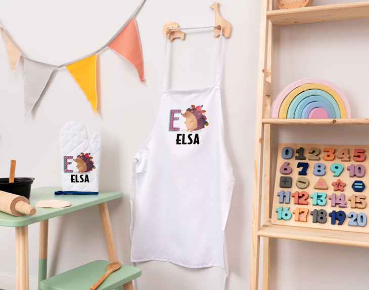 • Delantal infantil de cocina personalizado. • Manopla de cocina personalizado. • Tarjeta recordatoria.