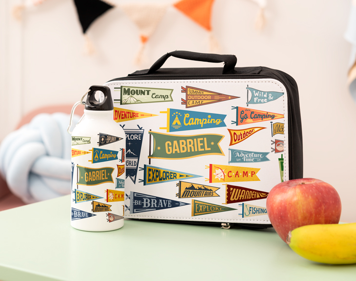 Verano es sinónimo de Sol, calorcito, playa, piscina y... ¡campamentos! A los niños les encanta pasar unos días fuera de casa, con sus amigos y haciendo un montón de actividades diferentes. En estos viajes no paran en todo el día, desde que se despiertan hasta que se duermen, no paran de hacer cosas y moverse. Por eso, como queman tanta energía, necesitan reponer fuerzas y con este kit de merienda personalizado será muy fácil. Podrán llevarlo donde quieran con la merienda que quieran: su bebida y comida favorita. ¡Es súper guay! Sabemos que a un campamento hay que llevar de todo. Los niños se hacen un poco mayores porque allí ya no están ni papá ni mamá para ayudarles con las tareas. Por eso, con este original kit de merienda no tendrá problema para comer esté donde esté. Cuenta con una lunchera y una pequeña cantimplora, ambas cosas perfectas para poder llevarlas donde queramos. ¡Nuestra merienda sestará lista para cualquier momento! Pero lo mejor de todo es que podrás personalizar este kit de merienda a tu gusto. Añade el producto al carrito y entra en el área de personalización. Nosotros te dejamos este diseño súper guay con banderines al estilo camping y solo tienes que poner el nombre que quieras en uno de ellos. Podrás personalizar la lunchera y la cantimplora por separado pero tendrán el mismo diseño y el mismo nombre, si quieres. Hecho esto, tu kit estará listo para acompañarte en todas tus nuevas aventuras. Medidas: 24 x 8 x 7 cm.