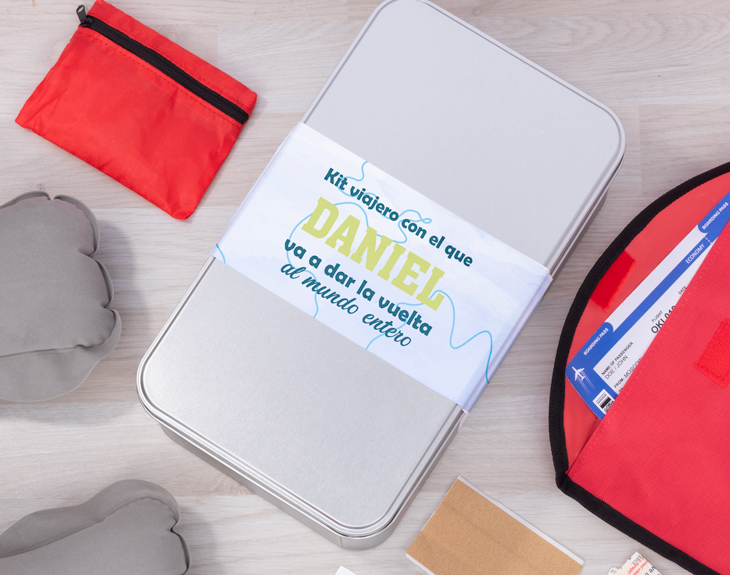 Si buscas regalos para viajeros y no te decides por una sola cosa, este kit personalizado le encantará. Incluye todo lo necesario para un viaje de larga duración: powerbank para que no se le quede el móvil sin batería, una almohada de viaje, un portadocumentos... Al adquirir el producto (y antes de pagar) se te preguntará el nombre para personalizar la etiqueta.