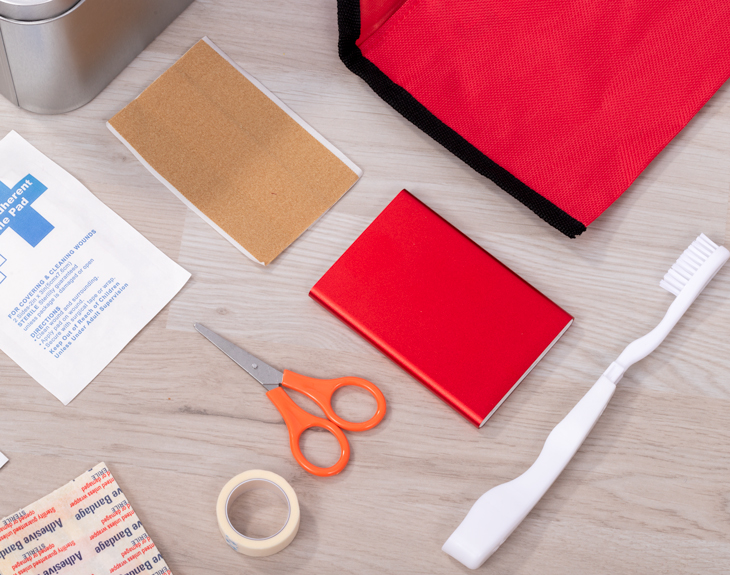 • Power bank. • Almohada hinchable. • Portadocumentos. • Cepillo de dientes portátil. • Botiquín (vendas, esparadrapo, tiritas, gasas, tijeras, almohadilla de preparación, cabestrillo, alcohol, tijeras). • Caja de metal con banda personalizada.
