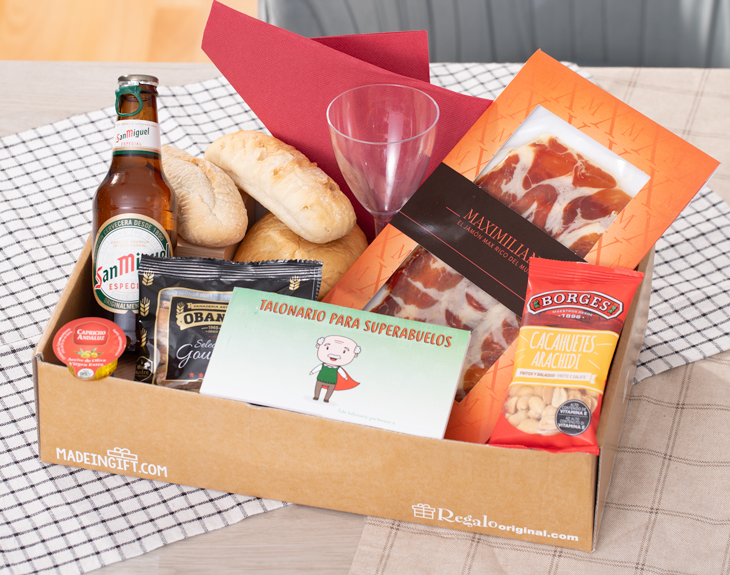 Kit de picoteo para sorprender a tu abuelo. Con él, podrá tomarse una cerveza y probar un jamón riquísimo a tu salud. Se incluye además un talonario con deseos para que tu abuelo canjee cuando él quiera.