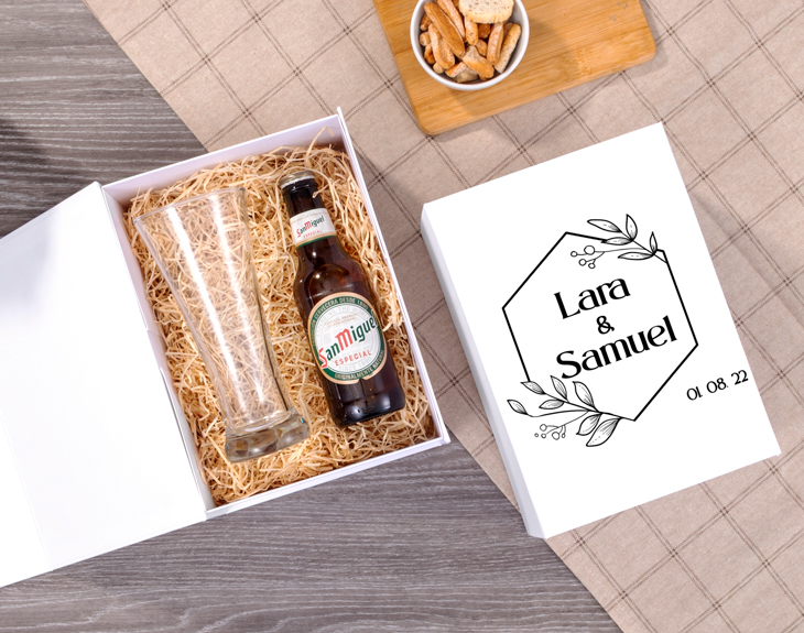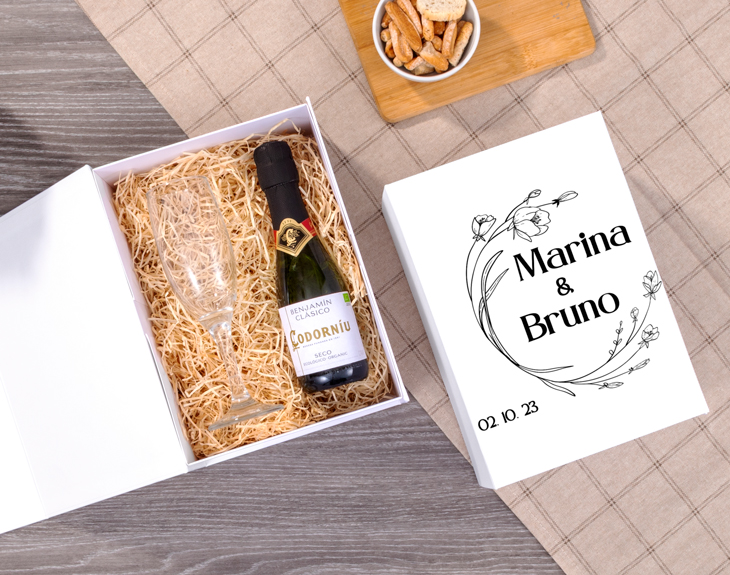 • Caja de cartón blanca (25x18x11cm). • Bebida. Las opciones son las siguientes: - Benjamín de cava de 200 ml. - Benjamín de vino de 350 ml. - Botellín de cerveza de 250 ml. • Copa de cristal de cava, de vino o weizen de cerveza. • Tarjeta Recordatoria. IMPORTANTE: prohibida la venta de bebidas alcohólicas a menores de 18 años.