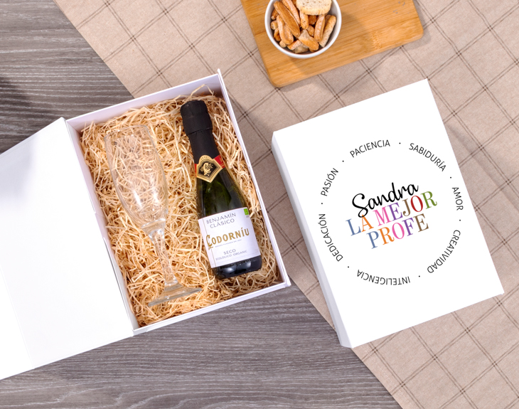 El mejor profesor del mundo mundial tiene que tener varias cualidades que son obligatorias: paciencia, sabiduría, inteligencia y, sobre todo, pasión por su trabajo. ¿El de tus hijos marca todas las casillas de la lista? Esta claro que este kit premium con bebida personalizado está hecho para él o ella. ¡Podrás incluir su bebida favorita en este curioso pack! Si estás buscando un regalo inusual con el que dejarle con la boca abierta, no habrá nada como este kit especial con bebida a elegir y copa con diseño de profes. Esta caja negra con cierre de imán contará en su interior con el tipo de bebida que prefieras entre las diferentes opciones disponibles: cerveza, cava o vino. ¡Cada una vendrá con su copa correspondiente! Un regalo original para profesores no quedaría completo sin su personalización, ajustada a ese profesor tan increíble que siempre ha estado ahí para ayudar. Añade al carrito la opción que más te guste y entra en el área de personalización, donde solo tendrás que clicar sobre el cuadro de texto para escribir el nombre que quieras. ¡Será un detallazo para el fin de curso! Medidas de la caja: 25 x 18 x 11 cm.
