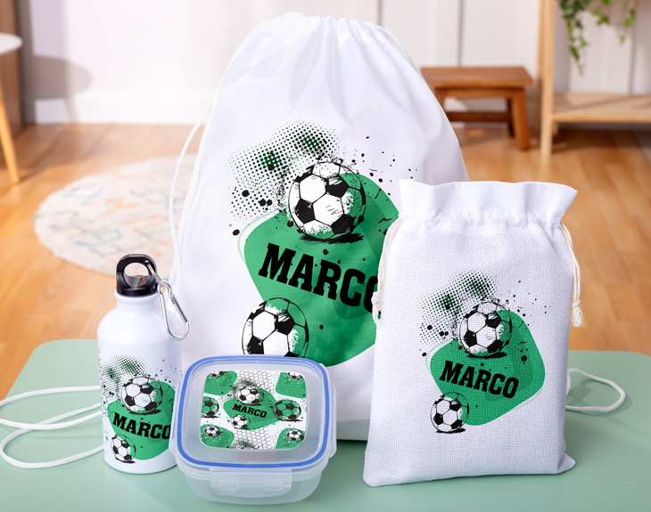 Si al más peque de la casa le encanta el fútbol y sueña con convertirse en un futbolista profesional... ¡Tenemos algo que le encantará! Se trata de nuestro kit personalizado para la vuelta al cole con diseño "Fútbol". ¡Podrás personalizar con su nombre todos los productos de este pack! Gracias a este pack la vuelta al cole será de lo más divertida. Este kit incluye un tupper de plástico, una mochila de cuerdas, una cantimplora de agua y una mini bolsita de tela. ¡Es súper completo! Viene de maravilla para llevarlo a las clases y poder guardar el almuerzo y llevar agua de manera práctica y cómoda. Por último, personalizar este pack vuelta al cole es muy sencillo. El primer paso a seguir consiste en añadir el producto al carrito y entrar al área de personalización. Una vez ahí, ya puedes escribir el nombre que tú quieras. Pronto estará perfecto y listo para regalar. ¡Será un original regalo para la vuelta al cole! - Túpper: Medidas: 12,5 x 12,5 x 6,5 cm. Material: plástico transparente. - Cantimplora: Altura de la botella: 17 cm. Capacidad: 400 ml. Material: Aluminio. - Mochila de cuerdas: Medidas: 34,5 cm x 41 cm. Material: suave poliéster 210T - Bolsita de tela: Medidas: 25 x 17,5 cm.