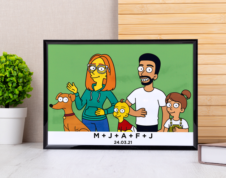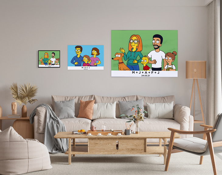 Si sois una familia tan divertida como los Simpson ha llegado el momento de crear una lámina personalizada con vuestros propios personajes al más puro estilo Simpson, ¡pareceréis unos vecinos más de Springfield! Sin duda, la mejor opción para decorar la entrada de vuestro hogar o ese rincón del salón al que le falta un poco de color. ¡Todas vuestras visitas os preguntarán por la lámina! Se trata del regalo perfecto para dejar sin palabras a tus personas favoritas, y es que, si tienes la suerte de haber nacido en la mejor familia del mundo ha llegado el momento de hacerles un detallazo como este. También es una gran idea para regalar a esos amigos que están formando poco a poco su famiila, solamente tienes que seleccionar los avatares que más se parezcan a ellos y nosotros nos encargamos del resto. Además, puedes escoger la opción que mejor se ajuste a vuestras necesidades, ya sea una lámina a4 con marco directa para colgar o, si la queréis para decorar un espacio más grande, la de 48x33cm o la de 60x85cm. También podréis seleccionar la opción digital para imprimirla en cualquier formato, compartirla en vuestras redes sociales o tenerla de fondo de pantalla. Para personalizarla solamente tendrás que elegir el número de personajes que quieres añadir y se abrirá nuestro diseñador. Allí podrás crear vuestros propios avatares simpson totalmente a medida; pelo, ojos, ropa, accesorios y mucho más. Además, en la parte inferior podrás incluir un texto como vuestros nombres o iniciales. Y no solo eso, también podrás cambiar el color del fondo, ¡será un diseño a medida al 100%! Importante: Si escoges la opción "versión digital" te enviaremos el diseño por mail en alta resolución. De esta manera, tendrá la calidad necesaria para que puedas imprimirla en cualquier formato. En el formulario de entrega tendrás que seleccionar la opción "Recibir por Email para ahorrar los gastos de envío". Importante: El color del marco puede variar según stock.