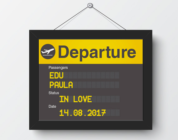 Aquí va un regalo divertido y económico para los más viajeros del lugar: una lámina personalizada inspirada en el Flight Board de un aeropuerto. Elige a los pasajeros, el status y la fecha, y te daremos un regalo de altos vuelos. Podrás hacerte con él en dos formatos: - Tamaño A4: se imprime en papel fotográfico y se presenta enmarcada. El marco, por cierto, está disponible en varios colores. - Tamaño gigante: 60 x 85 centímetros. La textura es tipo póster. Importante: El color del marco puede variar según stock.