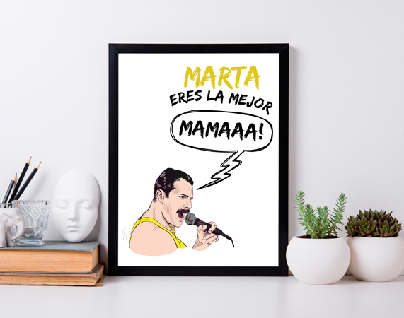 ¿Tu madre es una auténtica roquera? Si en tu casa siempre suena música de los 70-80 y Freddie Mercury es casi parte de tu familia, entonces esta lámina personalizada le va a alucinar. Cuelgala al lado de su disco favorito y crea el rincón más musical de la casa. ¿Por qué decirle a tu mamá lo mucho que la quieres pudiendo cantárselo? Pon Queen a todo volumen y recuérdale que es la mejor mamaaa del mundo. Por supuesto, lo personalizamos con su nombre para que sea aún más especial ¡Un detalle que nunca olvidará! Además, tienes la opción de adquirir la lámina enmarcada. Importante: El color del marco puede variar según stock. Podrás elegir esta lámina en dos tamaños: A4 o gigante, este último con unas medidas de 85 x 60 centímetros.