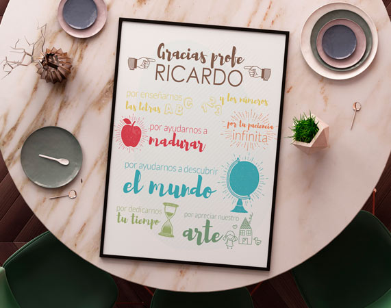 ¿Llevas tiempo queriendo agradecerle a tu profesor o profesora favorita todo lo que hace por vosotros? Nuestra lámina personalizada "Gracias por todo profe" es el regalo perfecto para impresionarla. Os ayuda a descubrir el mundo, a desarrollar vuestra creatividad y a ser mejores personas. Por toda la paciencia y tiempo que invierte en vosotros se merece un regalo así de especial. Solamente tienes que decirnos su nombre para personalizarlo. Además, puedes adquirir la lámina enmarcada. Importante: El color del marco puede variar según stock. Podrás elegir esta lámina en dos tamaños: A4 o gigante, este último con unas medidas de 85 x 60 centímetros.