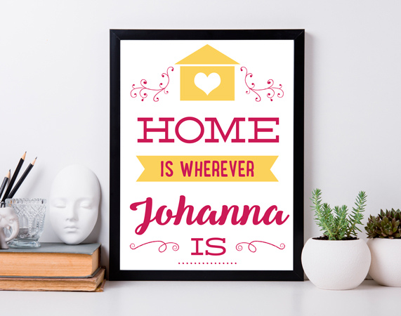 Muchas veces el hogar no son los lugares, sino las personas. Recuerda a la persona que más quieres que tu casa se encuentra donde ella esté con esta lámina personalizada. Es importante cuidar a las personas que queremos, y con este regalo conseguirás que se sienta la más especial del mundo. Nuestra lámina "Home is whereverer I'm with you" es perfecta para decorar vuestro hogar y hacerlo aún más acogedor. Por supuesto, ponemos el nombre de esa persona tan especial para ti. Además, tienes la opción de adquirir la lámina enmarcada. ¡Emocionarás seguro a tu persona favorita! Importante: El color del marco puede variar según stock. Podrás elegir esta lámina en dos tamaños: A4 o gigante, este último con unas medidas de 85 x 60 centímetros.