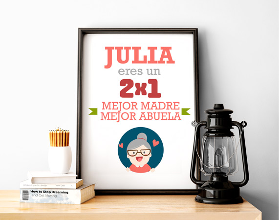 ¿Quieres dejar a tu abuela con la boca abierta? ¡Nuestra lámina personalizada "Madre & abuela" es la solución! No se nos ocurre una forma más original y divertida para recordarle a tu abuela lo importante que es para ti. ¿Qué harías sin la comida y los mimos de tu abuela? ¿O qué harían tus padres sin ella los días que tienen que trabajar? Siempre están dispuestas a ayudarnos en todo lo que haga falta, por eso se merecen que las cuidemos mucho. Porque son lo mejor que existe ¡De mayores todos queremos ser como nuestra abuela! ¡Seguro que tú también! Importante: El color del marco puede variar según stock. Podrás elegir esta lámina en dos tamaños: A4 o gigante, este último con unas medidas de 85 x 60 centímetros.