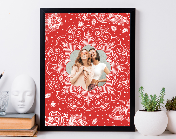 Inspirada en las figuras del Mandala, esta lámina personalizada está pensada para las parejas más románticas. Con una foto en el centro, en el corazón, enamorarás a tu pareja en cuanto abra el regalo. Es una bonita sorpresa si no pasáis por momentos felices o si, simplemente, quieres sacar una enorme sonrisa. Elige la foto que más te guste y tendrás esta lámina para colgarla en vuestro dormitorio o cualquier rincón de la casa. Podrás elegir esta lámina en dos tamaños: A4 o gigante, este último con unas medidas de 85 x 60 centímetros. Lo pongas donde lo pongas, llenará de amor ese lugar. ¡Qué romántico! Importante: El color del marco puede variar según stock.