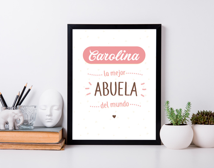 Si quieres darle una sorpresa a tu abuela y sacarle una gran sonrisa, esta lámina personalizada es el regalo perfecto. Nuestra lámina La mejor abuela del mundo es perfecta para demostrar a tu abuela lo mucho que la quieres y darle las gracias por todo lo que ha hecho por ti cuando eras más pequeño. Personalizar esta lámina es muy sencillo, solo nos tendrás que decir el nombre de tu abu y nosotros lo grabaremos en este diseño tan tierno. Seguro que se emocionará mucho y pondrá esta lámina en el salón de su casa. ¡Le encantará! Podrás elegir esta lámina en dos tamaños: A4 o gigante, este último con unas medidas de 85 x 60 centímetros. Importante: El color del marco puede variar según stock.