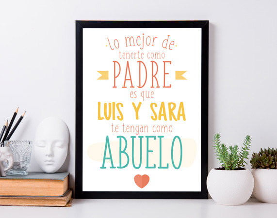 Esta lámina personalizada es perfecta para que un padre como el tuyo se emocione en el Día del Padre, en su cumpleaños o en cualquier ocasión. Lo más bonito de un padre es que te haya cuidado cuando eras pequeño y que, ahora, sea el mejor abuelo del mundo con tus hijos. ¿Ocurre esto en tu familia? Dinos el nombre o los nombres de sus nietos y personalizaremos este lienzo para que le des una sorpresa enorme a tu padre y abuelo de tus niños. Importante: El color del marco puede variar según stock. Podrás elegir esta lámina en dos tamaños: A4 o gigante, este último con unas medidas de 85 x 60 centímetros.