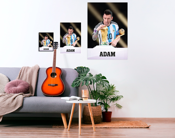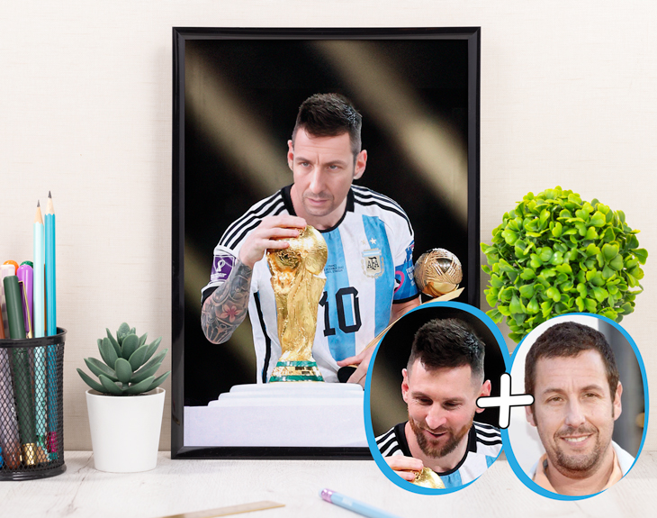 ¿Quieres sentirte como el mejor jugador de fútbol del mundo? Ponte en la piel de Messi con nuestra lámina personalizada y este diseño tan especial que seguro que te sorprenderá. Seguro que alguna vez has querido ser como tu ídolo, ¿verdad? Pues con este súper regalo, te convertimos en Messi en un momento. Sí sí, como has leído, nosotros nos encargamos de fusionar tu cara con la del jugador. ¡Es lo más! Si estás buscando el regalo perfecto para sorprender a esa persona que es súper futbolera, esta original lámina es justo lo que necesitas. Se quedará sin palabras cuando va su cara fusionada con la de su jugador favorito. Y lo mejor de todo es que podrás elegir cómo quieres recibir este diseño: en formato digital, tamaño A4 con marco, grande o gigante. ¡Hay para todos los gustos! No te preocupes porque personalizar esta lámina es súper fácil. Añade el producto al carrito y entra en el área de personalización. En ese momento solo tienes que subir la imagen que tú quieras al sistema y ver cómo ocurre la magia y esa persona se convierte oficialmente en Messi. ¡Será el regalo más original del mundo! Importante: recomendamos subir una imagen donde la cara se pueda ver claramente. Es preferible que la persona no lleve accesorios como gafas o gorras ya que podría distorsionar la imagen. Contamos con varios tamaños de lámina distintos: lámina junto con el marco a tamaño A4, lámina grande de 48 x 33 o una lámina de tamaño póster de 85 x 60 cm. ¡Escoge el que más te guste! Importante: El color del marco puede variar según stock.